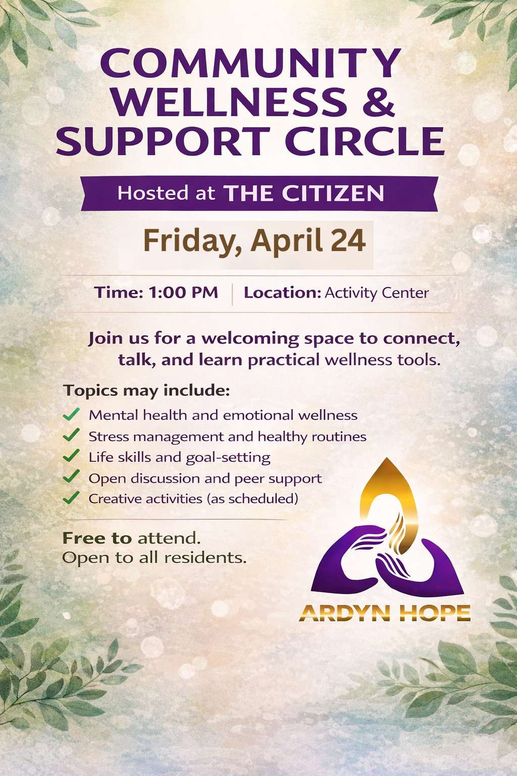 A resident-based wellness circle focused on community connection, life skills, and mental health support. This event is exclusively for residents of The Citizen Apartments.