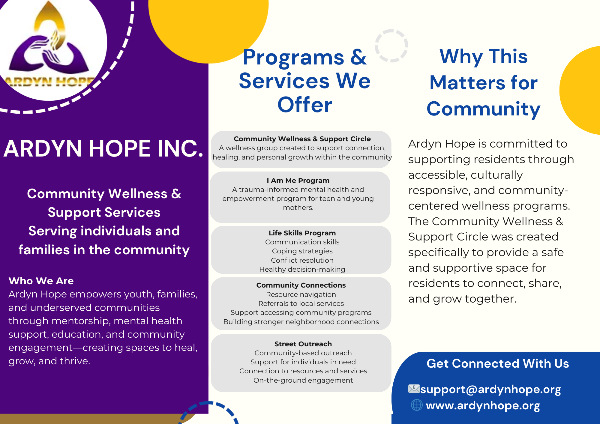 Ardyn Hope empowers youth, families, and underserved communities through mentorship, mental health support, education, and community engagement. We create spaces where individuals can heal, grow, and build the confidence and resources they need to thrive—no matter their starting point. Grounded in lived experience and committed to creating opportunities, we walk alongside those we serve as they navigate their journey toward stability, self-sufficiency, and hope..